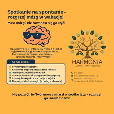 Centrum Terapii i Rozwoju Harmonia w Bełchatowie organizuje cykl trzygodzinnych warsztatów dla dzieci i młodzieży w wieku 9–14 lat. Zajęcia mają charakter edukacyjno-rozwojowy i łączą gry logiczne, zadania kreatywne oraz ćwiczenia uwagi i pamięci. Oferta skierowana jest do uczestników, którzy chcą w aktywny sposób wykorzystać część wakacji na rozwijanie umiejętności poznawczych i pracy zespołowej.